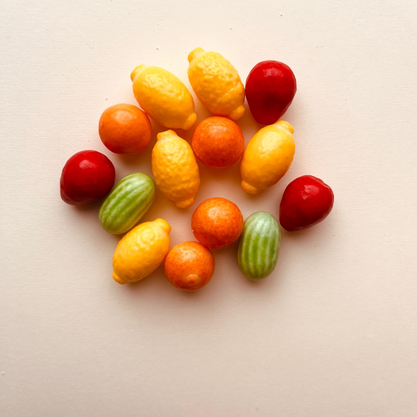 Zutaten: Zucker, Glukosesirup, KAUMASSE (SOJALECITHIN), Aroma, Säuerungsmittel: Apfelsäure, Überzugsmittel: Bienenwachs, Carnaubawachs, Farbstoff: Kurkumin, Echtes Karmin, Brillantblau FCF, Paprika-Extrakt