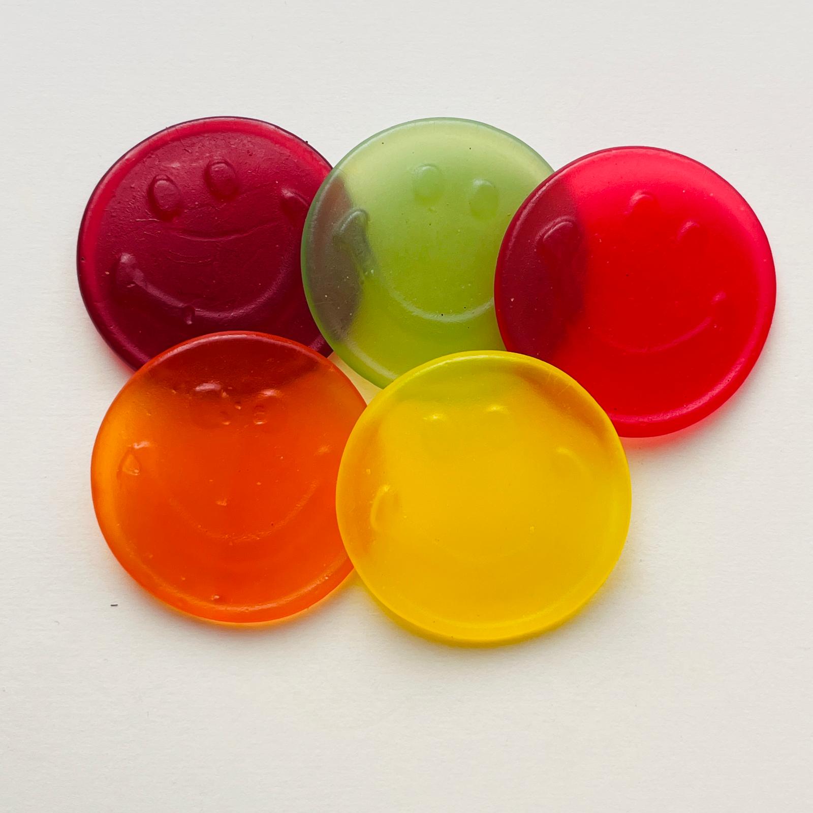 Zutaten: Glukosesirup, Zucker, modifizierte Stärke, Stärke, Gelatine, Säuerungsmittel: Milchsäure; Aroma, pflanzliche Öle: Kokos, Palm; Konzentrat von Schwarzwurzel, schwarzer Johannisbeere, Karotte, Spirulina, Saflor; Überzugsmittel: Bienenwachs; Farbstoff: Kurkumin, Paprikaextrakt.