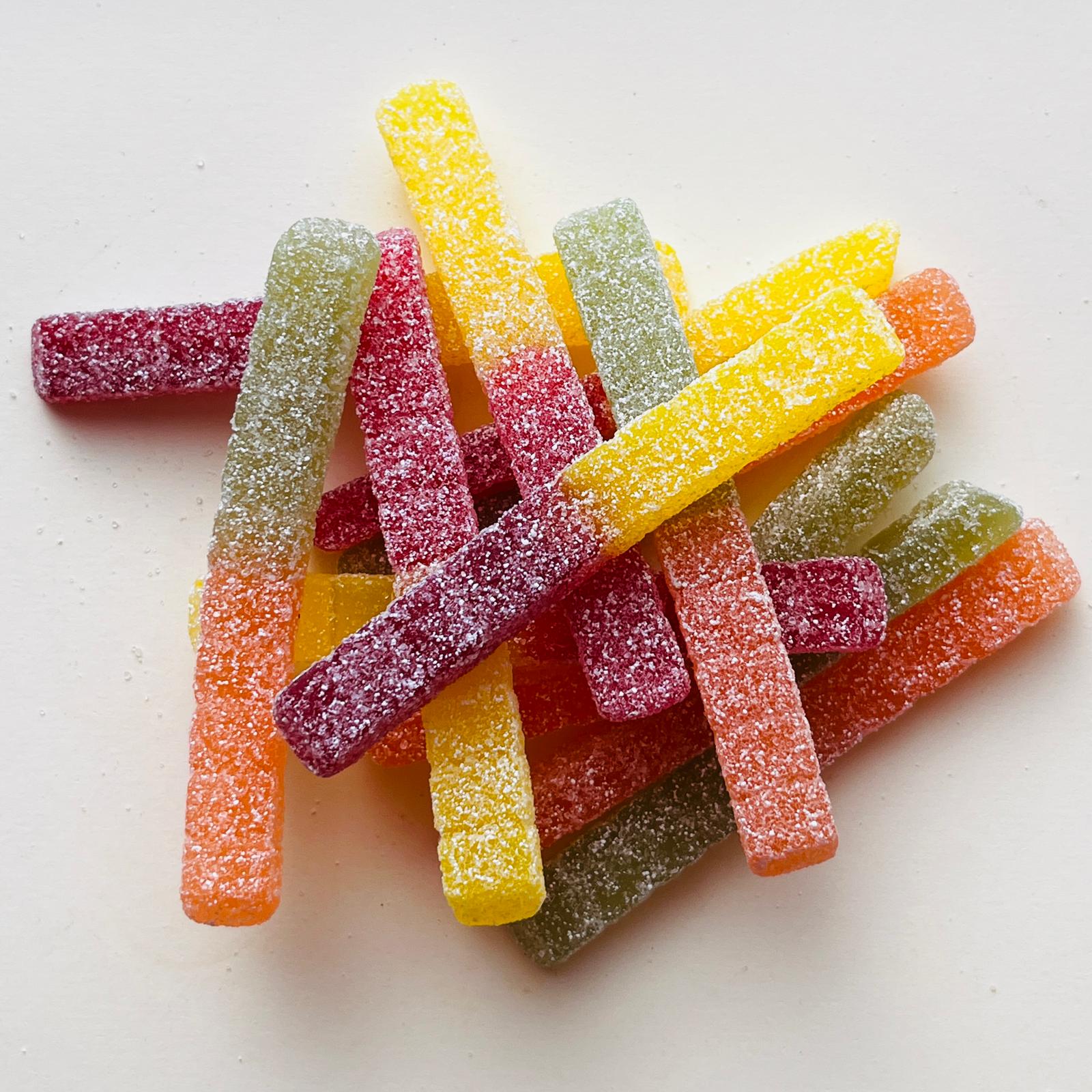 Zutaten: Zucker, Glukosesirup, modifizierte Speisestärke, Säuerungsmittel: E270, E296; Gelatine, natürlliche Aromen, Säureregulator (Natriummalate), Frucht- und Pflanzenkonzentrate (schwarze Karotte, Karotte, schwarze Johannisbeere, Saflor, Spirulina), Farbstoffe: Paprikaextrakt, Kurkurmin.